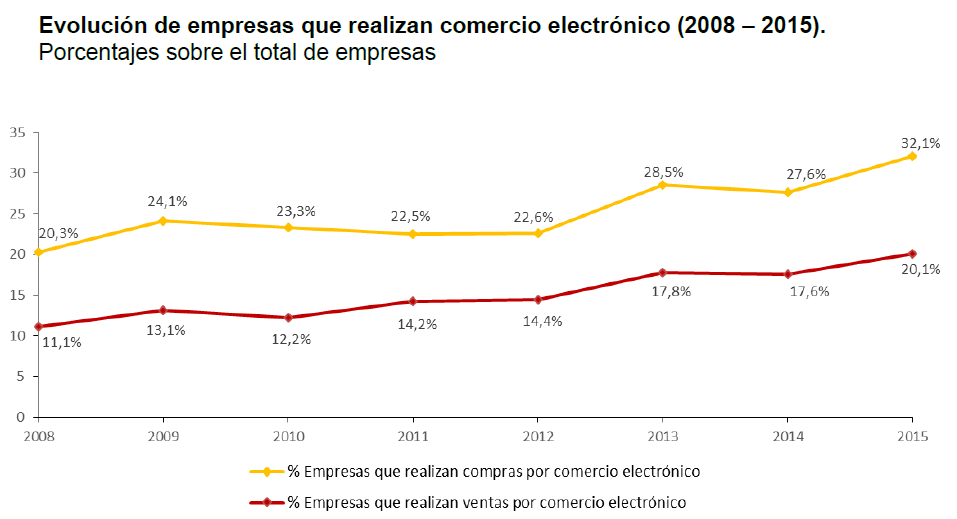 Este gráfico muestra la tendencia en empresas (en porcentaje sobre las totales) que realizan compras o ventas por comercio electrónico. En volumen ocurre más o menos lo mismo. Una de cada tres realiza compras y una de cada 5 ventas por correo electrónico…..y subiendo de forma imparable. Es el futuro y lo sabemos.